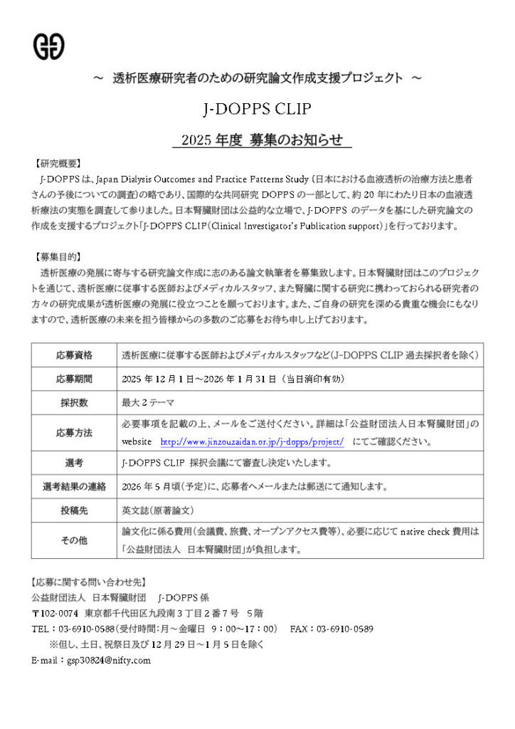 ~透析医療研究者のための研究論文作成支援プロジェクト~ J-DOPPS CLIP 2025年度募集のお知らせ